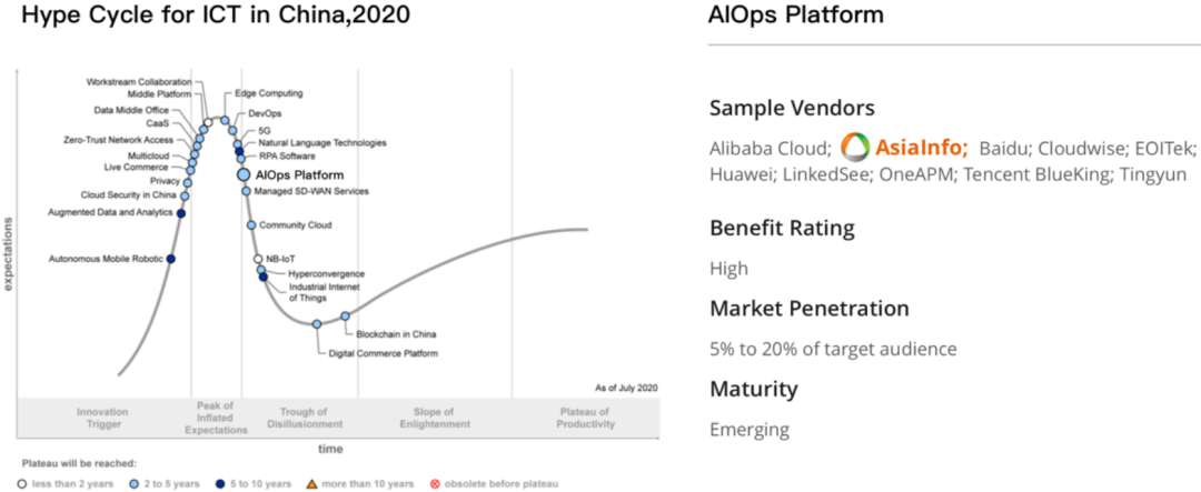 日前,全球ICT权威咨询分析机构Gartner发布“2020中国ICT技术成熟度曲线-Gartner Hype Cycle for ICT in China 2020”,亚信科技AISWare AIOps智能运维平台产品荣登Gartner2020年度技术成熟度曲线典型供应商榜单。这是亚信科技在AI领域产品首次进入Gartner技术成熟度曲线Hype Cycle,标志着亚信科技智能运维产品及解决方案在该领域的领先地位。