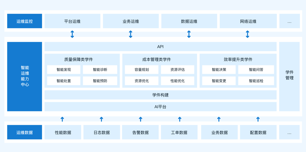 高内聚运维学件:围绕质量保障、成本管理和效率提升三大方向,提供高内聚、低耦合的场景化运维学件,轻量级能力对接生产,支撑运维智能化需求的快速落地,便于复制和推广;