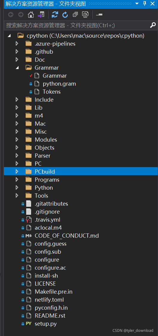 然后进入到代码目录:/cpython/pcbuild/,点击里面的pcbuild.sln就能打开整个工程,接着打开vs的解决方案管理器,点击小房子右边的图标,将视图转换为文件夹视图,我们能看到整个python内核的代码层级结构: