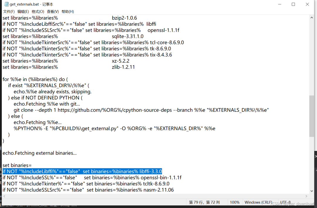 现在我们还不能直接编译其代码,因为有不少依赖组件还没有下载。在pcbuild目录下有一个get_externals.bat脚本,它就是专门用来获取外部依赖组件的。但是这个脚本需要做一些修改,因为里面有一个组件由于版本问题不能直接下载,使用笔记本打开它,然后修改如下: