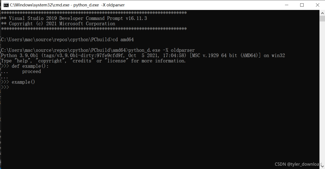 从vs中启动命令行后,按理其路径应该在PCBuild下面,如果你的机器是64位,那么编译好的可执行文件就在amd64下,因此cd进去,然后执行python_d.exe -X oldparser,这样启动的python运行环境,其对应的编译器就使用了我们修改后的语法,然后如上图输入一段代码,使用proceed替换pass,执行后可以看到编译器能够识别关键字proceed,其作用跟pass一样。