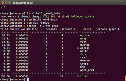 还有一个强力工具叫strace,它能追踪程序对系统API的调用情况,甚至能发现程序从文件中读取了那些数据,首先构建一个名为hello.txt的文本文件,里面包含一行字符串:“hello world!”,然后创建sys_read.c,在里面调用系统接口open和read来读取文件内容: