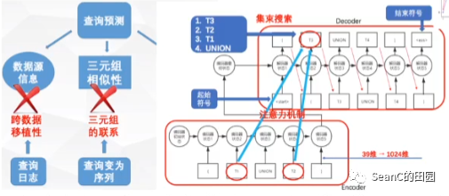 目的:实现高效、跨数据源可用的SPARQL查询预测 效果:利用序列模型进行查询预测,有效提高了查询的缓存命中率 解决方案:以信息完备性、还原性、泛化能力为原则,将三元组视为整体,查询视为一个序列,以位置信息表达三元组,对三元组使用等价类划分。使用seq2seq的模型进行序列预测,加入注意力机制对不同时刻的输入添加相应权重,使用集束搜索降低单个时间步预测出错造成的误差
