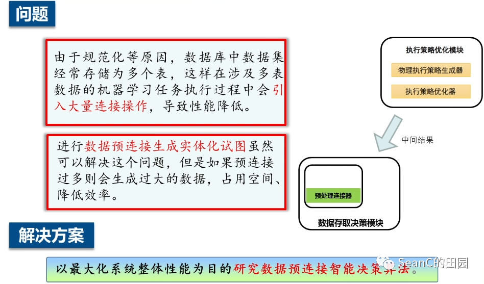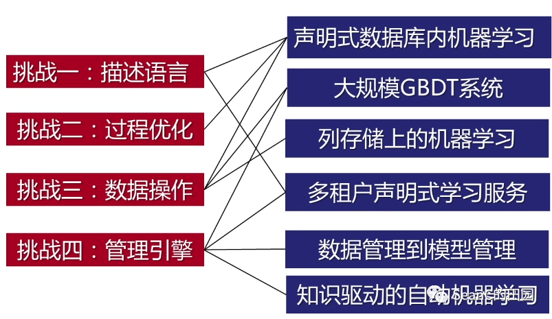 现有的存储和索引技术不够灵活 对于较为复杂的算法依然不能够完全嵌入到数据库中执行 原始数据、中间结果和模型的存取依靠有经验的DBA实现 机器学习任务的执行优化基本依靠手工完成 尚未有统一的机器学习优化技术来对任务进行执行优化 毫无经验的用户很难实现高效的模型学习