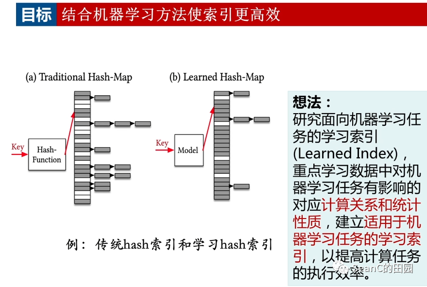 代价/工作负载预测 (操作代价的预测、未来工作负载预测后可优化系统) 学习增强算法 (视图选择/存储划分等为NP难问题,机器学习提供求解问题的新途径) 机器学习驱动的查询优化 (查询优化是难的问题,特别是当查询很大的时候,性能受限/准确度下降) 机器学习驱动的索引推荐 (同一组数据可能有多种索引可选,对workload的预测?数据类型/分布的掌握?) 机器学习驱动的存储选择 (对于不同类型数据,即使是同一种模态,都可以有不同的存储选择模式, e.g. 行存储/列存储,图数据:native graph/k-v/relational) 学习索引 (将索引看成是一种预测) ...