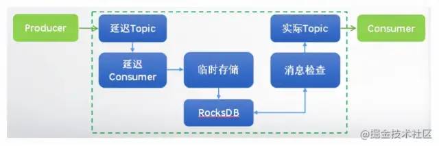 专门为要延迟的消息创建一个Topic新建一个消费者去消费这个Topic消息持久化再开一个线程定时去拉取持久化的消息,放入实际要消费的Topic实际消费的消费者从实际要消费的Topic拉取消息。