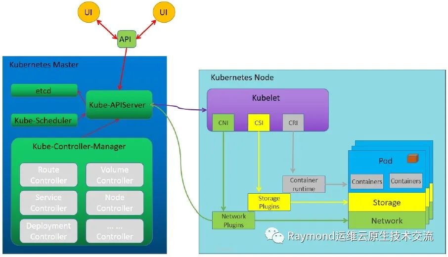 当然master它只是完成了领导性的任务,你可以理解为它就是一个管理中心,后续它要完成这些k8s里的工作,比如要跑一些服务还是要靠真正的node节点或者叫work节点来完成的,这些work节点和k8s之间怎么连接呢,就需要依赖于提供的三个接口,k8s为了支持更多的平台,k8s准确来说它实际上就是一个有点像淘宝一样的平台,它可以向外提供很多的第三方接入,你可以寄居在k8s的生态圈里边开发自己和k8s结合的各种组件,只要遵守它的相关接口规范即可,它的接口有3个接口,第一个叫容器运行时接口,这个容器运行时接口也就是说k8s管理的是容器,但这个容器到底用的是什么技术呢我们不关心,只要你遵守这个规范就可以了,有一个CRI的接口叫容器运行时接口,这个接口就是一种规范就是一种标准,你只要遵守这种规范不论你是用哪种容器技术都可以支持,当然目标来讲提供CRI最主流的技术仍然是docker,换句话说CRI以docker为主,但是目前已经并不唯一,也有一些其它的CRI也提供了,只要遵守这个CRI标准k8s就可以进行连接进行容器的管理;第二个叫CNI叫网络接口,这个网络接口简单的说就是通过k8s跨网络和node节点的的容器进行通讯,这个也需要有网络的解决方案,网络的解决方案也是要遵守这种k8s提供的网络接口规范的,这个接口规范目前来讲主流的有flannel和calico等等若干个解决方案这是用的比较多的,待会去部署k8s集群也必须要部署对应的CNI的某一种,如果不部署就相当于网络是没办法连通的,它是依赖于网络插件的,这些都是以插件方式提供的,因为k8s它只是提供了接口具体怎么实现我并不关心,你只要符合这个规范都是可以支持的;第三种叫CSI也就是存储,将来在k8s节点中运行的这些应用有可能需要有一些存储的需求,比如要存放数据、存放日志等这些需要有存储,存储也提供了一个所谓的叫CSI的接口,这个CSI接口来让我们这些工作节点将来把一些数据存放在某个地方,这个也是有一个规范的,不过应用有些没有存放数据的需求,所以CSI并不是一个必备的要求,你可以不需要。