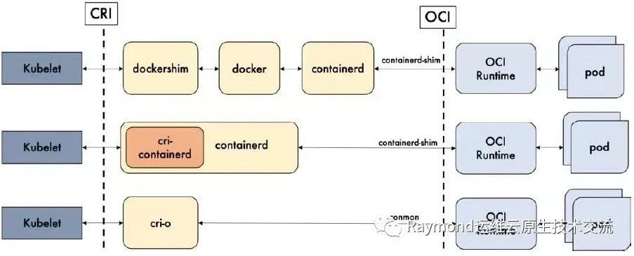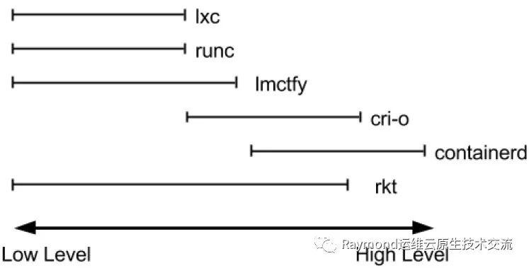 dockershim, containerd 和cri-o都是遵循CRI的容器运行时,我们称他们为高层级运行时(High-level Runtime)