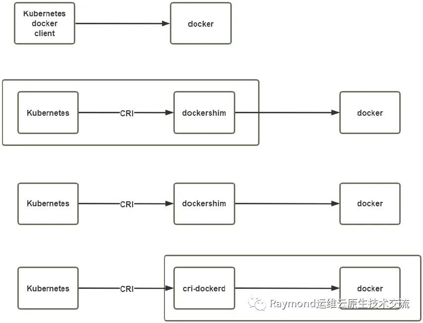 k8s和docker之间的关系,上面4张图详细的描述了k8s和docker之间的从蜜月期到后期的分道扬镳中间的分分合合的历史,首先刚开始k8s刚刚诞生的时候docker已经在市面上有很强的市场号召力,而且它基本上已经是容器的唯一选择,在市面上没有容器的其它技术所竞争,所以k8s为了使用容器被逼无奈降低身段和docker密切结合,它当时去使用docker的话采用的机制很简单就是在k8s里面内置了一个docker的客户端,docker命令实际上它就是个客户端,在系统中运行docker它会开启一个守护进程,docker命令实际上就是充当客户端的,k8s为了使用docker它就开发在k8s里边内置了一个客户端直接连接docker从而就可以使用docker的容器了,这是最早时候的状态;