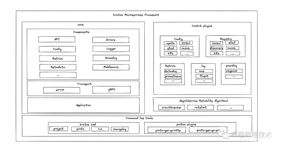 框架核心,包含了基础的 CLI 工具,内置支持了 HTTP/gRPC 传输协议,提供了服务的完整声明周期管理,提供了如 API 、日志 、错误处理、 配置、监控、序列化、注册发现、元数据传递、传输层、中间件等组件能力和相关接口定义。contrib