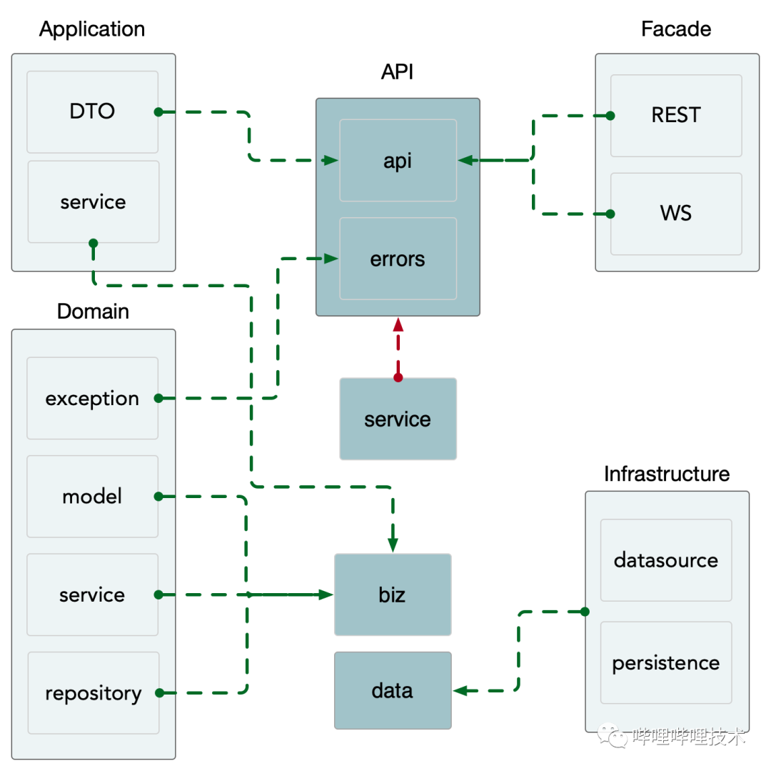 │ └── service // 实现了 api 定义的服务层,类似 DDD 的 application 层,处理 DTO 到 biz 领域实体的转换(DTO -> DO),同时协同各类 biz 交互,但是不应处理复杂逻辑