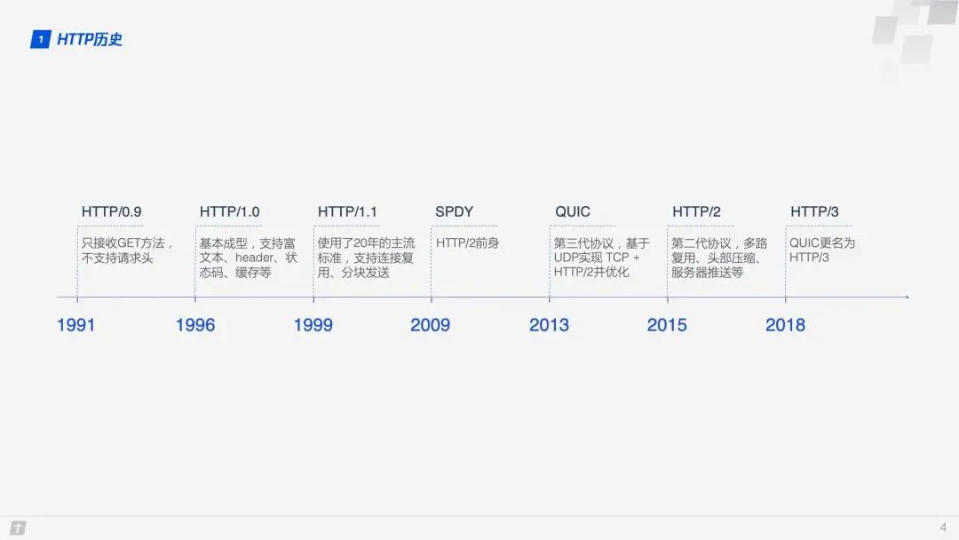 1991 HTTP/1.1 2009 Google 设计了基于TCP的SPDY 2013 QUIC 2015 HTTP/2 2018 HTTP/3
