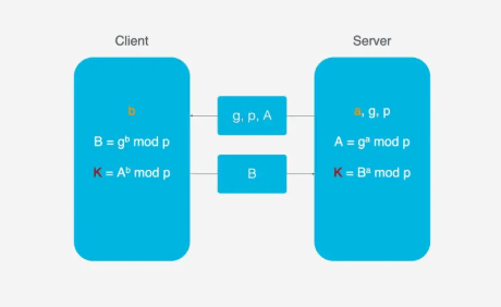 这里使用DH密钥交换算法, DH算法的核心就是服务端生成a,g,p3个随机数, a自己持有, g和p要传输给客户端, 而客户端会生成b这1个随机数, 通过DH算法客户端和服务端可以算出同样的密钥. 在这过程中a和b并不参与网络传输, 安全性大大提升. 因为p和g是大数, 所以即使在网络传输中p, g, A, B都被劫持, 靠现在的计算力算力也无法破解.