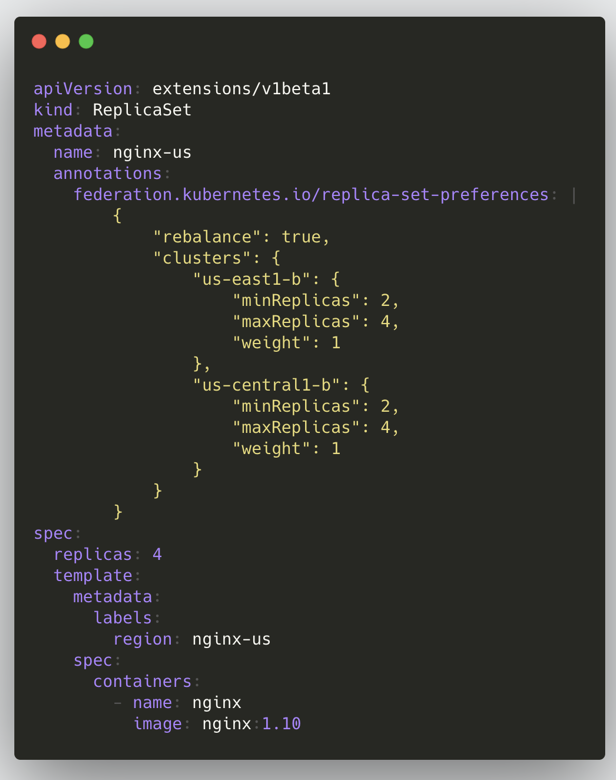 在 v1 版本中我们要创建一个联邦资源的大致步骤如下:把联邦的所有配置信息都写到资源对象 annotations 里,整个创建流程与 K8s 类似,将资源创建到 Federation API Server,之后 Federation Controller Manager 会根据 annotations 里面的配置将该资源创建到各子集群;下面是一个 ReplicaSet 的示例: