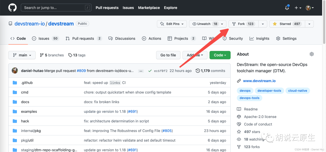 GitHub 上的项目都有一个 Fork 按钮,我们需要先将开源项目 fork 到自己的账号下,以 DevStream 为例: