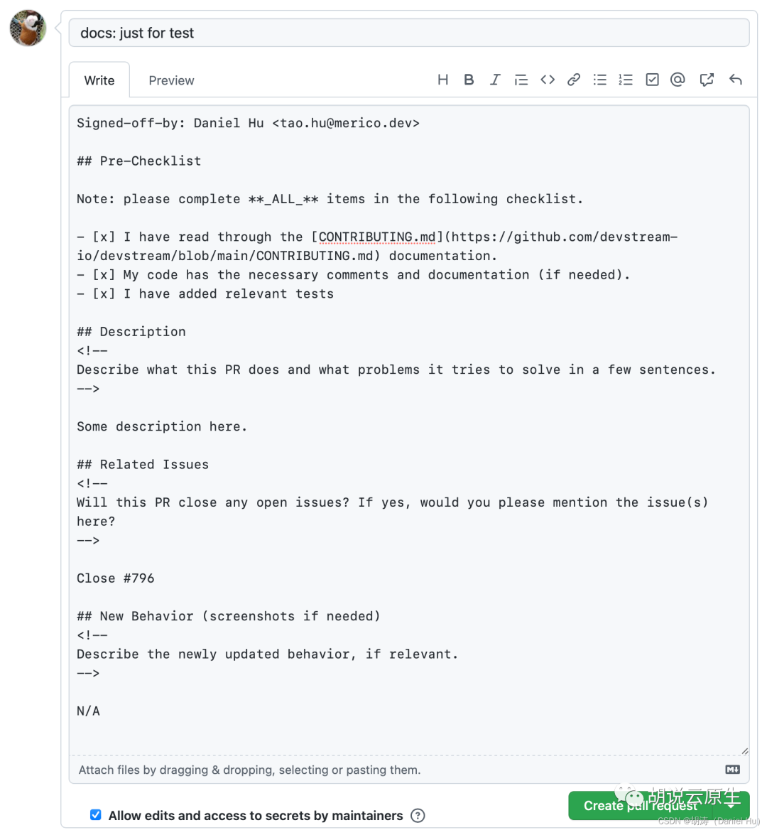 那么今天我想尝试彻底讲明白“如何正确地提交一个 PR”,尝试细说 GitHub 上的 PR 全过程,以及这里面可能会遇到的各种困难和解决办法。一方面希望对第一次参与开源项目的新人有所帮助,另一方面希望能够进一步降低 DevStream 社区和 DevLake 社区的参与门槛。