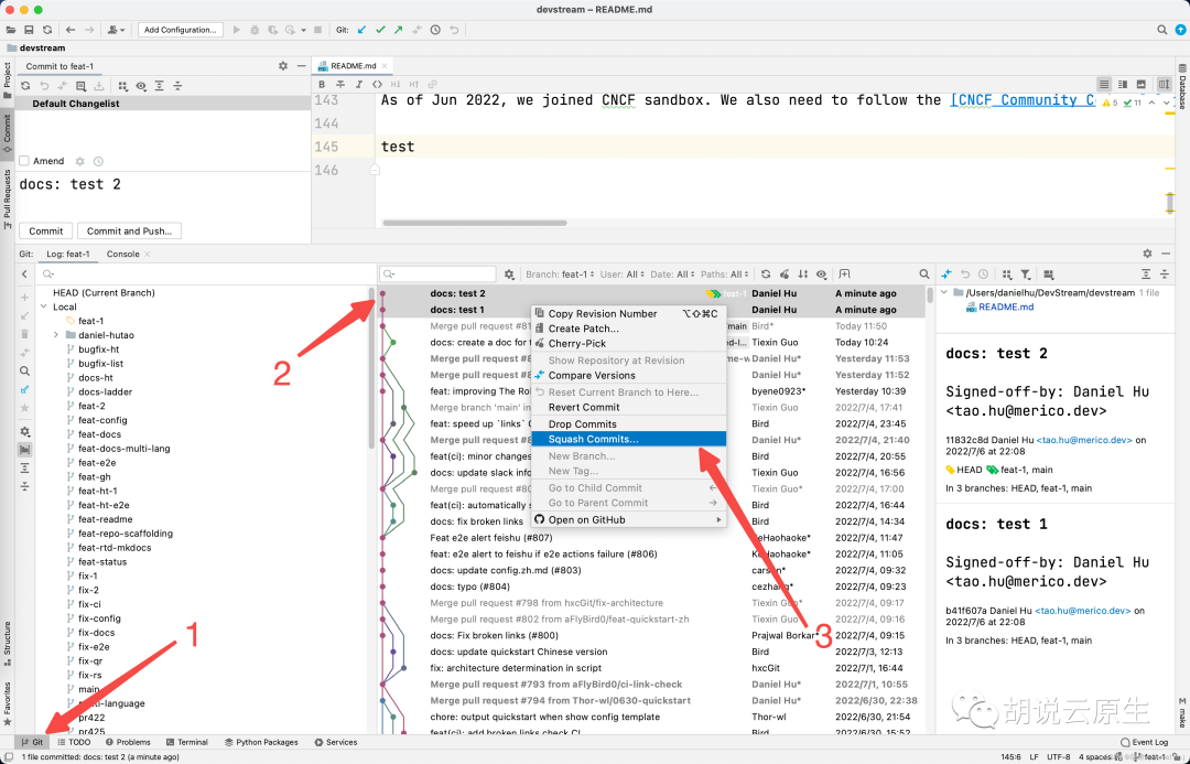 点击右下角的 Git 选择想要合并的 commits 右键,然后点击 Squash Commits,记得嘴里默念一句:走你!