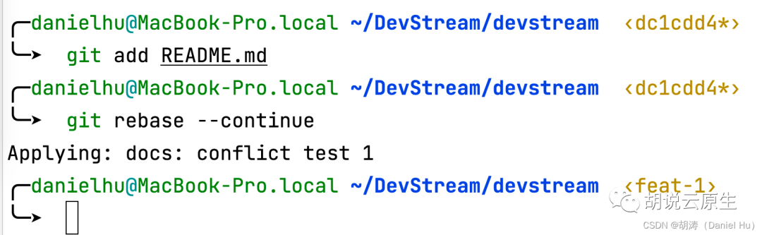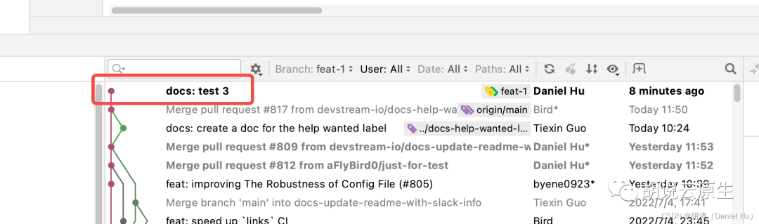 至于什么时候可以在线解决冲突,什么时候适合本地解决冲突,就看大家如何看待“需不需要保留解决冲突的记录”了,不同社区的理解不一样,可能特别成熟的开源社区会希望使用本地解决冲突方式,因为在线解决冲突产生的这条 merge 记录其实“没营养”。至于 DevStream 社区和 DevLake 社区,我们推荐使用后一种,但是不做强制要求。