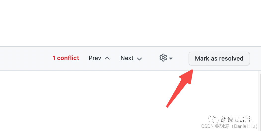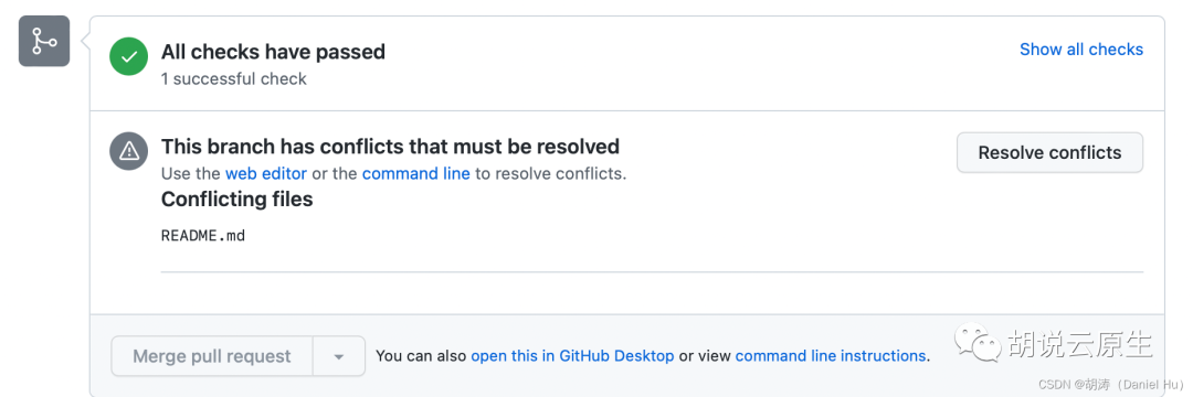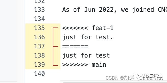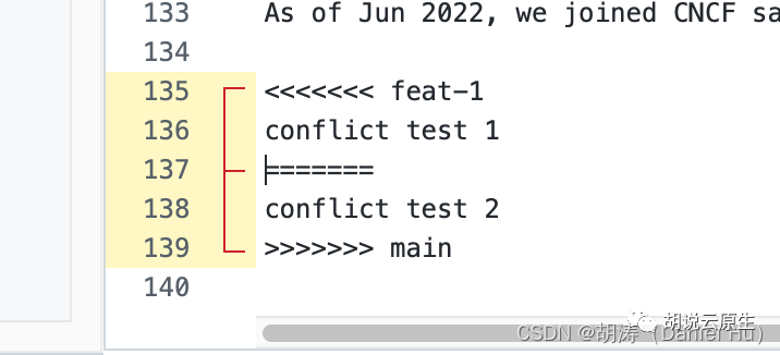我们要尽可能避免冲突,养成每次写代码前更新本地代码的习惯。不过,冲突不可能完全避免,有时候你的 PR 被阻塞了几天,可能别人改了同一行代码,还抢先被合入了,这时候你的 PR 就出现冲突了,类似这样(同样,此刻我不能真的去上游项目构造冲突,所以下面用于演示的冲突在我在自己的 repo 里):