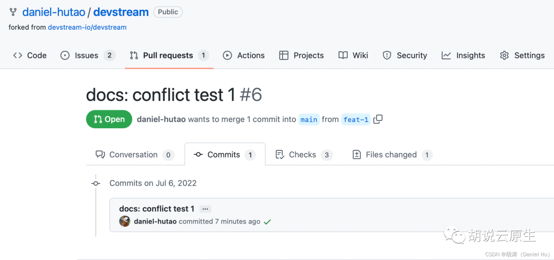 这时候我们再回到 GitHub 看 PR 的话,可以发现冲突已经解决了,并且没有产生多余的 commit 记录,也就是说这个 PR 的 commit 记录非常干净,好似冲突从来没有出现过: