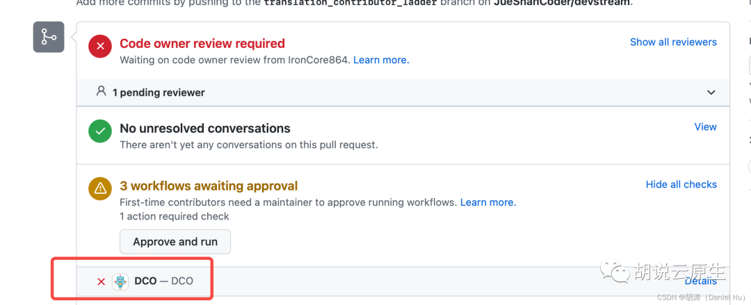 但是如果如果你第一次提交的 PR 里忘记了在 commits 中添加 Signed-off-by 呢?这时候,如果对应开源项目配置了 DCO 检查[13],那么你的 PR 就会在 ci 检查中被“揪出来”没有正确签名。