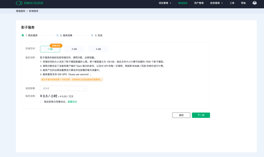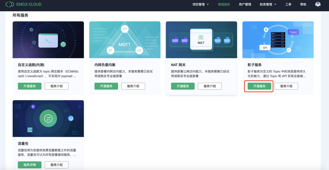 目前影子服务提供 1G 规格 7 天的免费试用。您可以登陆 EMQX Cloud,通过顶部菜单「增值服务」模块或左侧菜单「影子服务」模块开通影子服务。