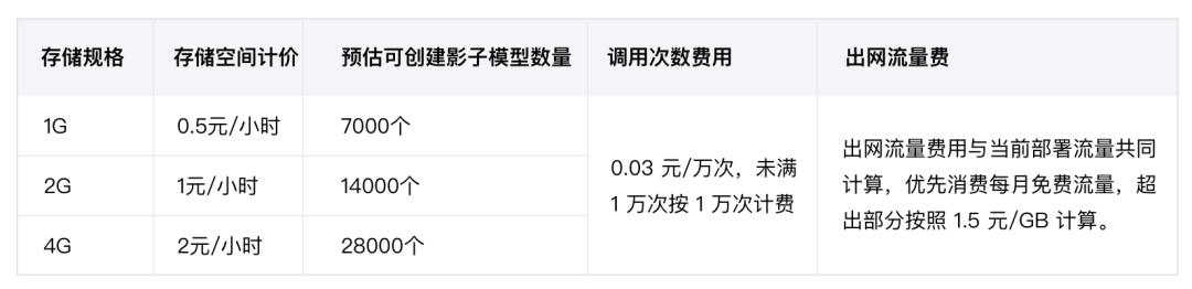 您可以根据预估所需要的影子模型数量选择不同存储空间规格,不同存储规格的价格和与顾客创建影子模型数量可参考如下表格: