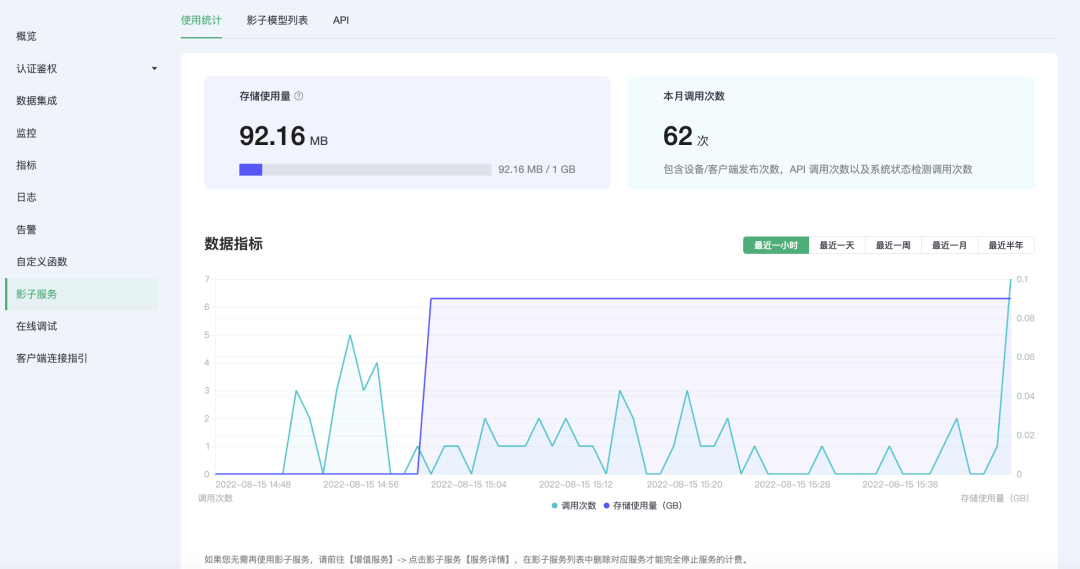 在「使用统计」页面,您可以通过存储使用量、本月调用次数和不同时间维度使用量变化折线图及时了解当前部署的影子服务使用量,对业务用量进行监控和预警。