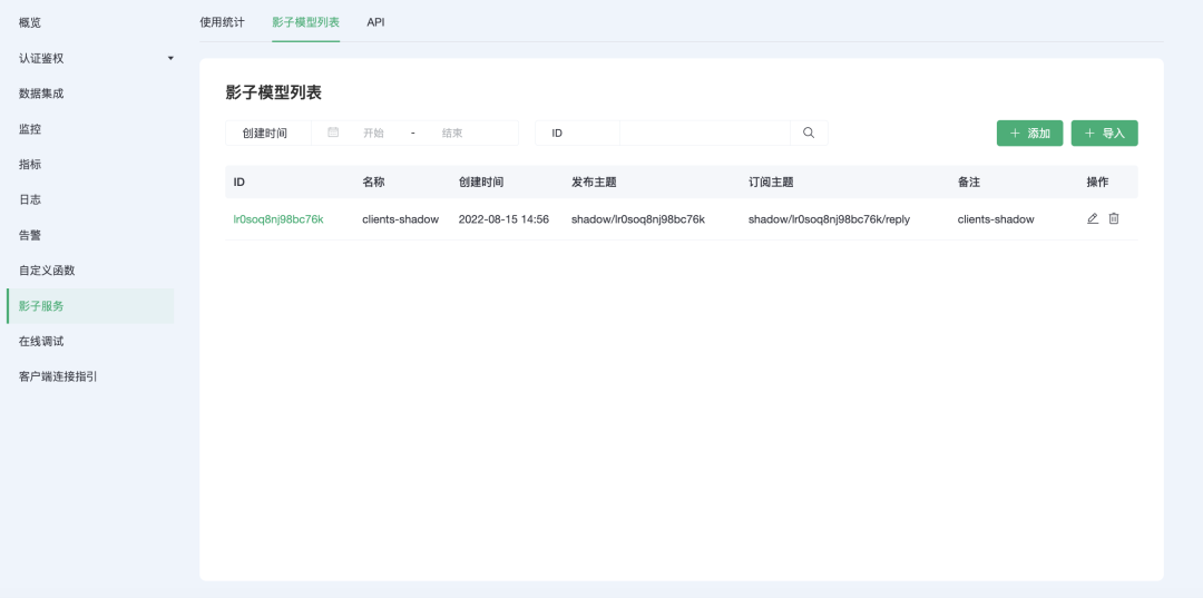 在「影子模型列表」页面,您可以添加、编辑、修改影子模型,并且可以通过模板批量导入自定义的影子模型。