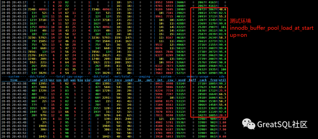 下面对比了开、关参数对系统IO的影响时长,可以看到开启innodb_buffer_pool_load_at_startup=on,系统IO比较长的一段时间内处于ioutil为100%的情况