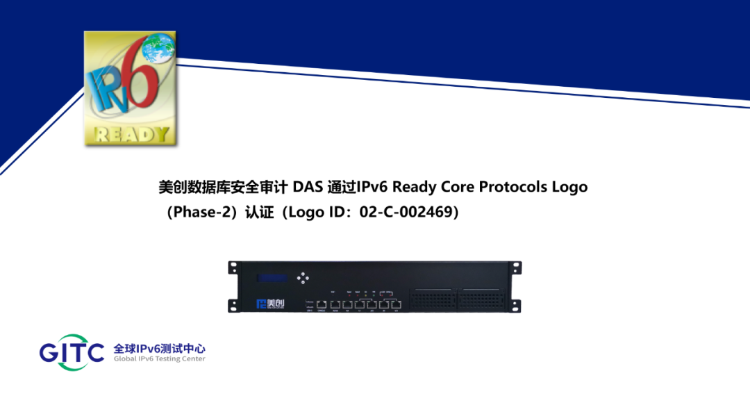 近日,美创科技数据库安全审计DAS在下一代互联网国家工程中心-全球IPv6测试中心正式通过IPv6 Ready核心协议Phase-2测试,并荣获由国际组织IPv6 Forum颁发的IPv6 Ready Logo Phase-2认证证书(Logo ID:02-C-002469)。
