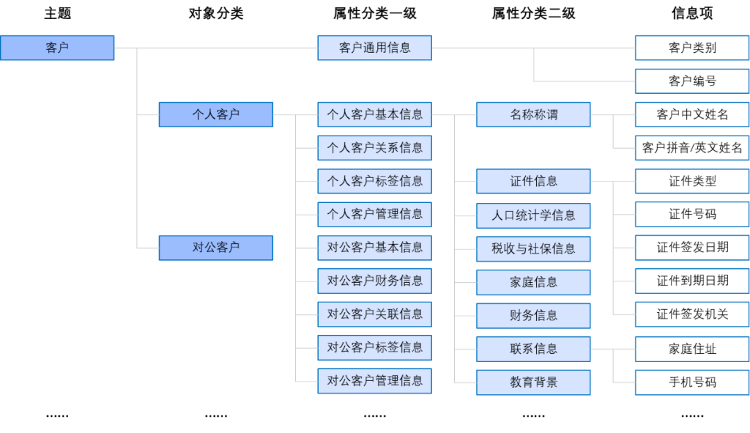 以业务领域构建资产目录为例,可以通过资产盘点,梳理银行数据主题分类/核心业务板块,再根据业务要素逐步向下划分二级目录、三级目录,最后到叶子结点的信息项上。信息项的定义也是从业务出发,梳理业务板块都有哪些数据内容,例如客户信息包括:客户名称、联系方式、地址、证件类型、证件号码等。