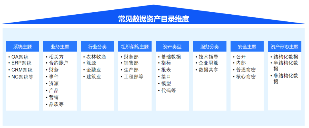 在数据资产分类中,以目录结合标签的形式进行数据资产分类,通常以系统主题、业务主题、组织架构主题3个维度作为目录视角,其它的维度作为标签。上图中可能罗列得不是很全,但是分类的方法和维度应该对大家有所帮助,我们可以分为系统主题、业务主题、行业、组织架构主题、资产类型、服务分类、安全主题、资产形态主题等。