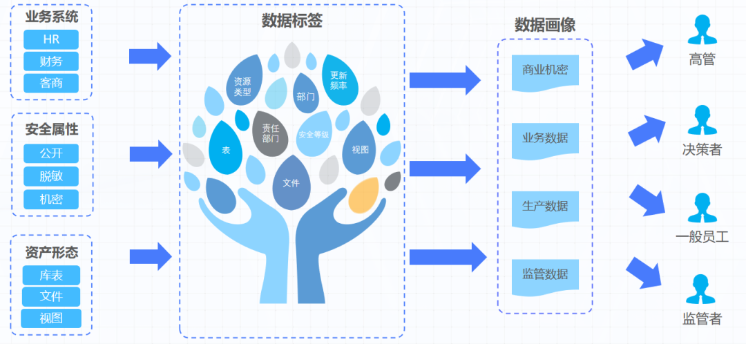 每一个数据资产具备多个属性,同样也归属于多个分类。按照不同的业务域、应用系统、重要程度、数据分布、更新频率、资产类型、安全等级、保密等级等维度,构建资源标签体系,完善资源画像,使各类数据消费者都能快速发现和获取需要的数据。