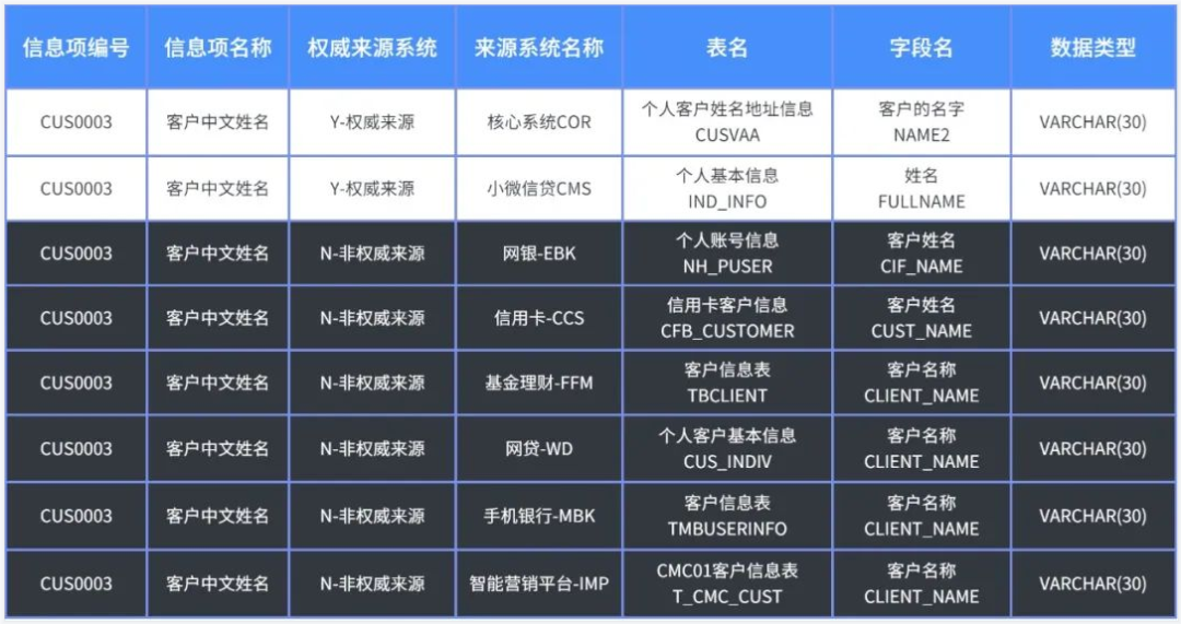 我们以“客户中文姓名”这一信息项为例,梳理数据来源与系统表映射关系如下: