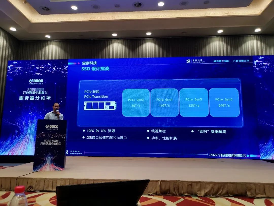 宝存科技作为企业级和数据中心存储的优秀企业,同时也是开放数据中心委员会的一员,在峰会上展示了旗下PCIe Gen4以及Gen5企业级存储产品,并由宝存科技产品研发副总姜海先生,在2022开放数据中心峰会中的服务器分论坛上发表题为《数据中心SSD的设计挑战和创新》的演讲,分享了一系列关于企业级SSD在面对技术发展中的设计挑战和应对。