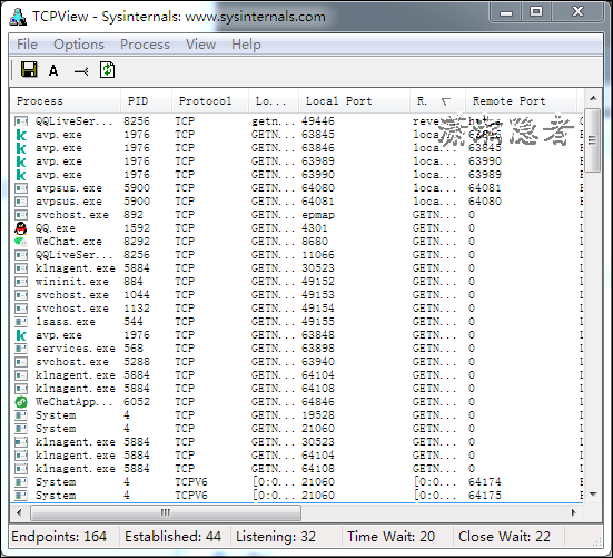 使用tcpview利器查看端口信息,这个工具不仅能显示当前服务器的端口(Local Port),还能看到一个TCP连接对应的远程端口号等信息。