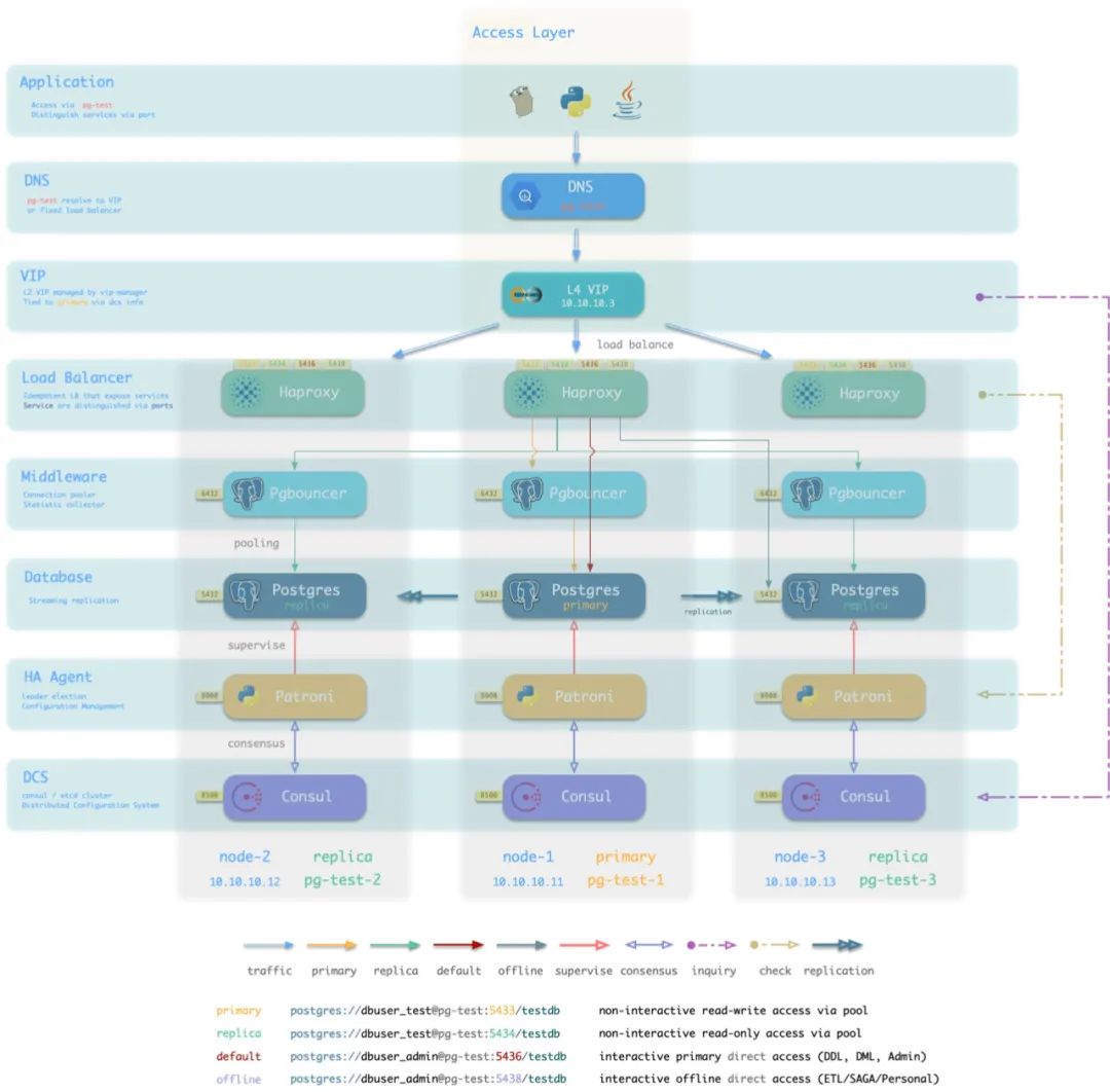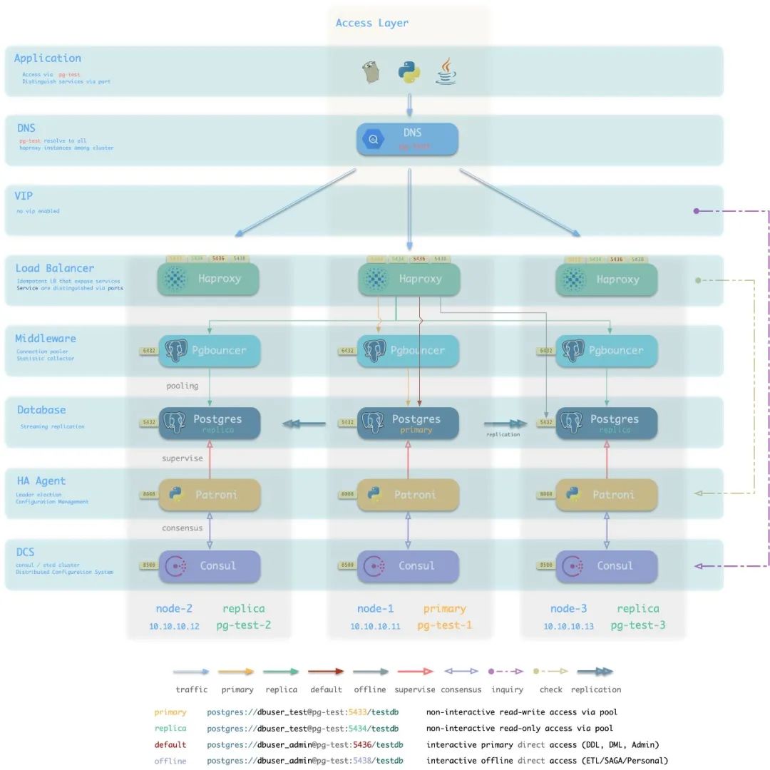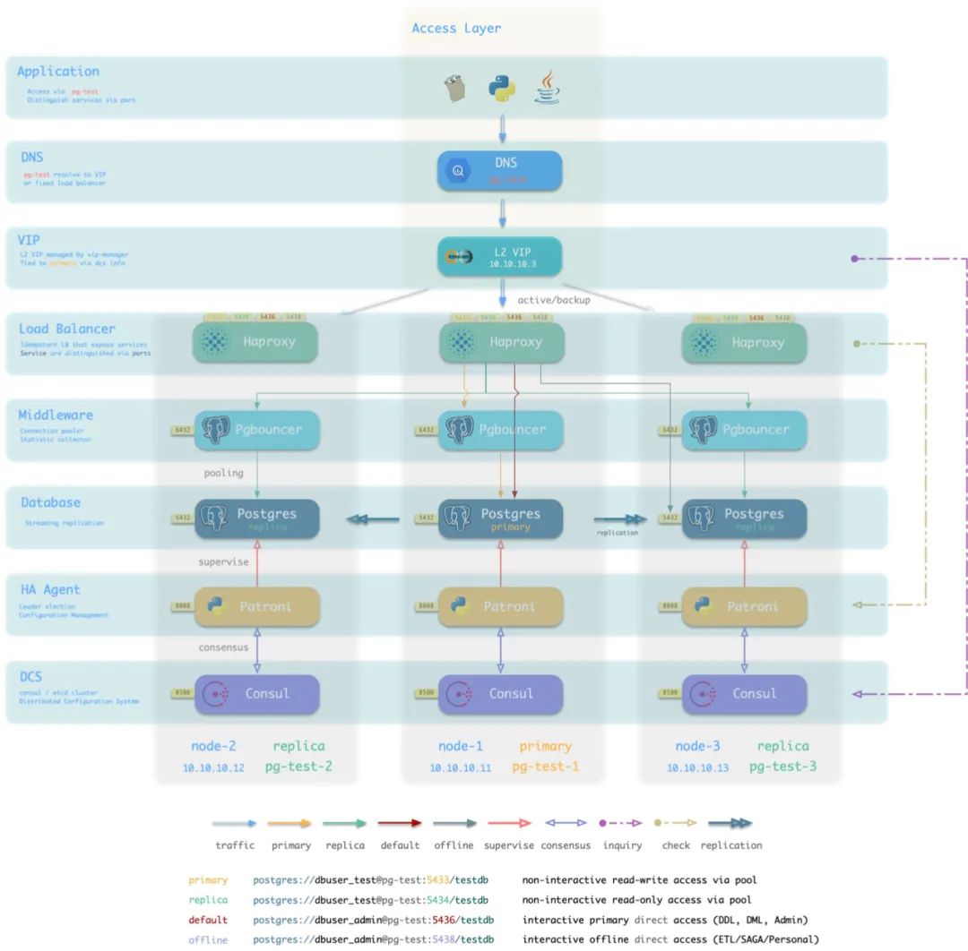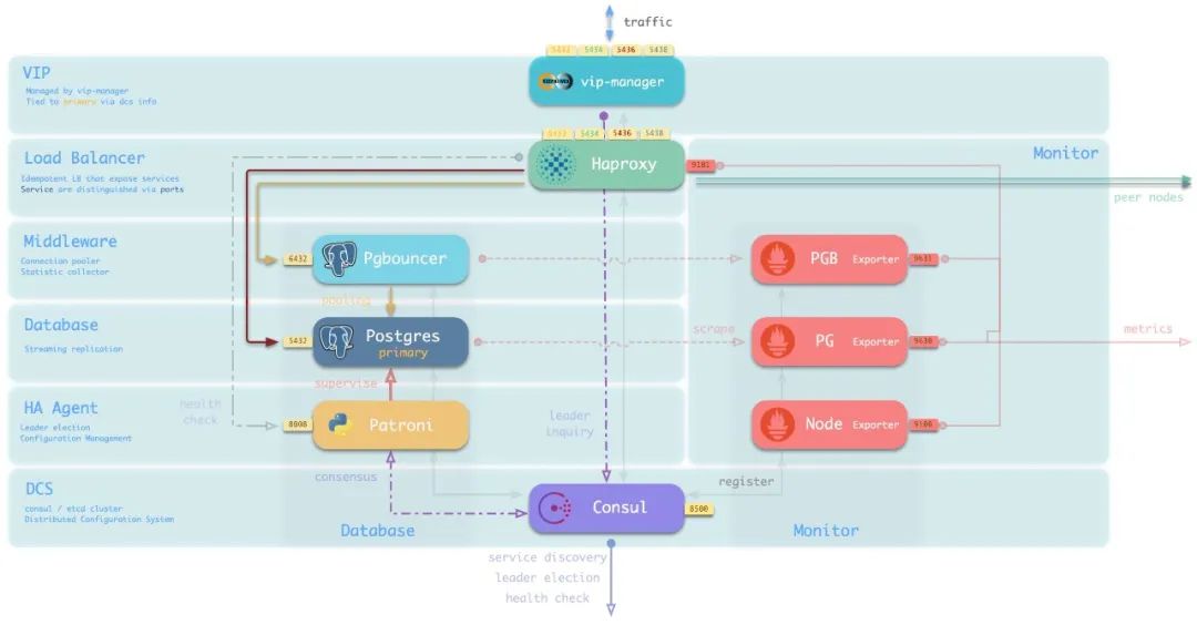 通过查询Consul获取集群主库信息,将集群专用L2 VIP绑定至主库节点。Haproxy是数据库流量入口,用于对外暴露服务,使用不同端口(543x)区分不同的服务。