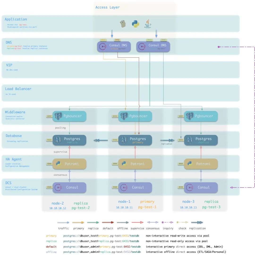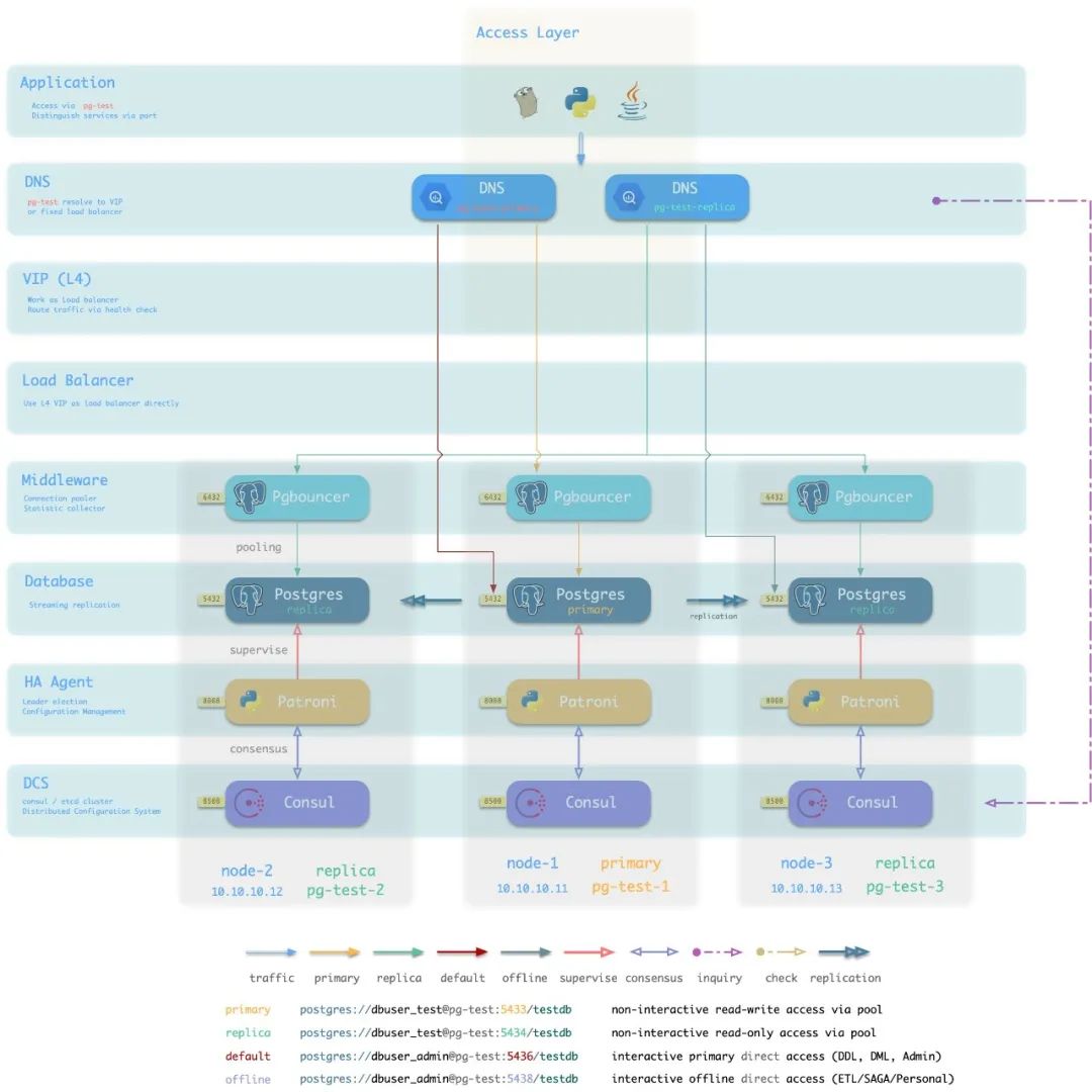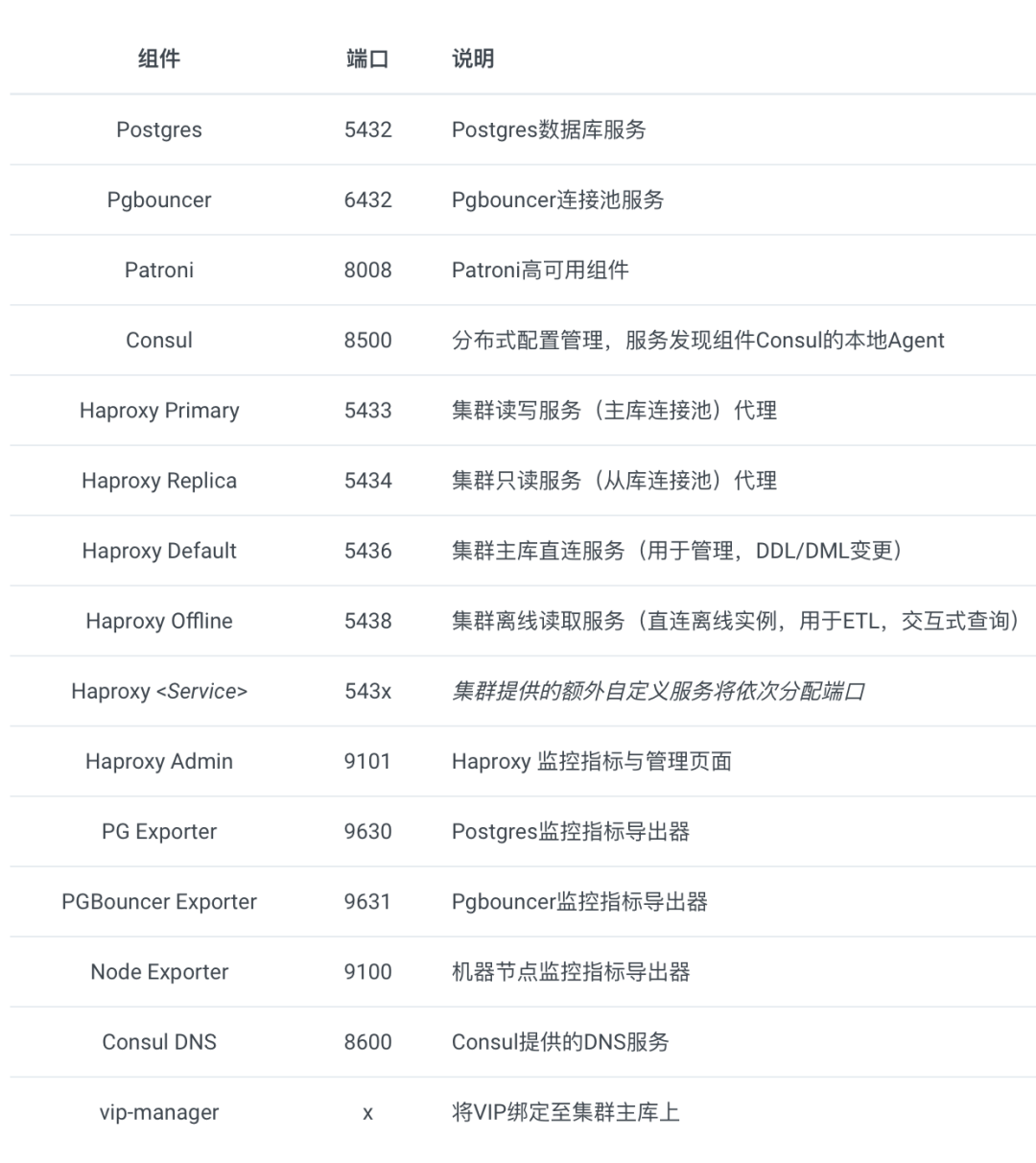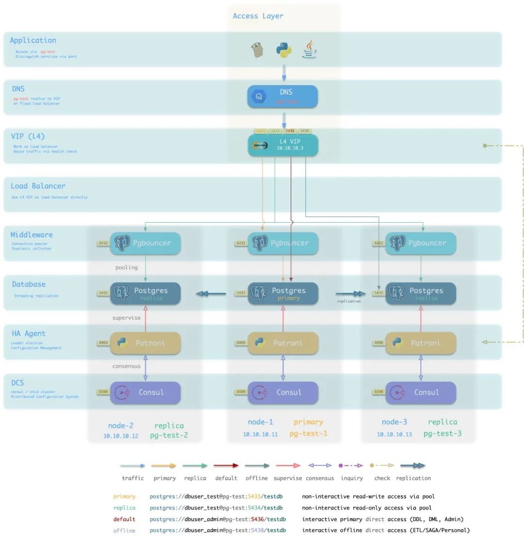 通过查询Consul获取集群主库信息,将集群专用L2 VIP绑定至主库节点。Haproxy是数据库流量入口,用于对外暴露服务,使用不同端口(543x)区分不同的服务。
