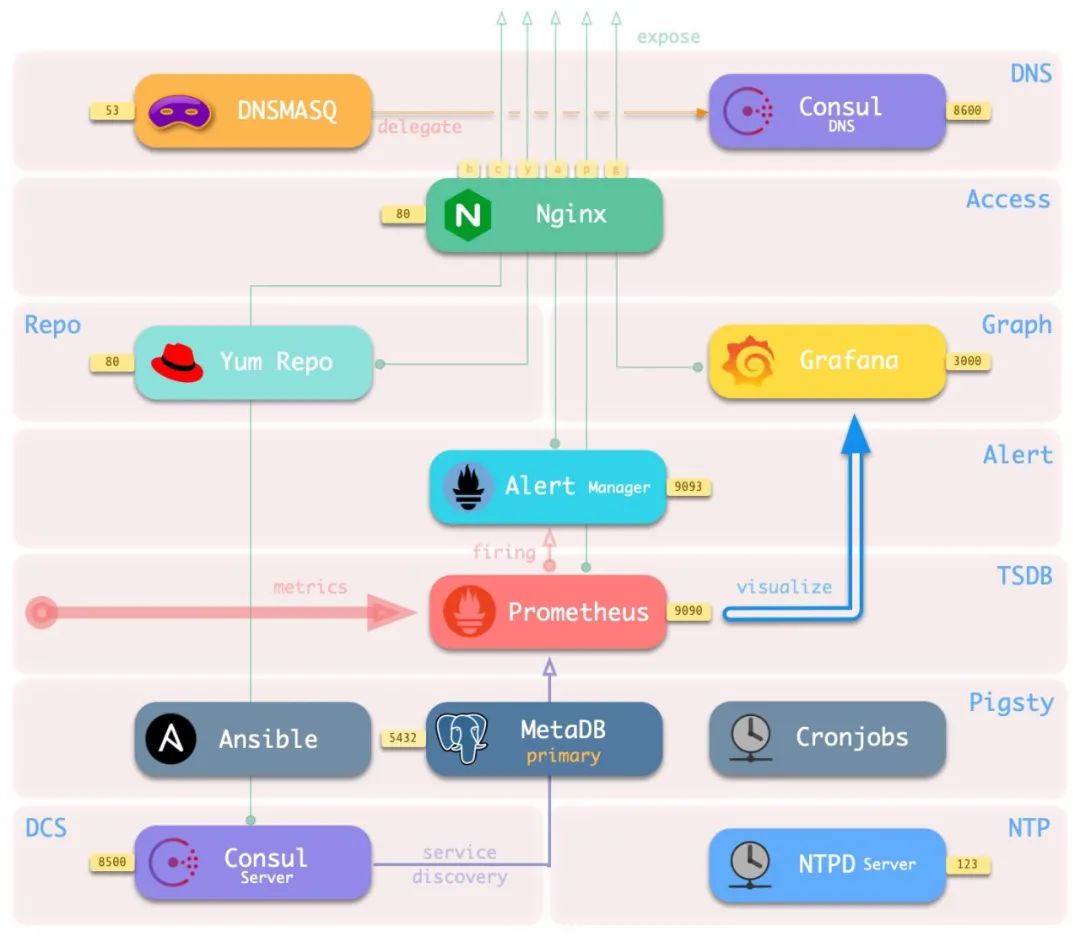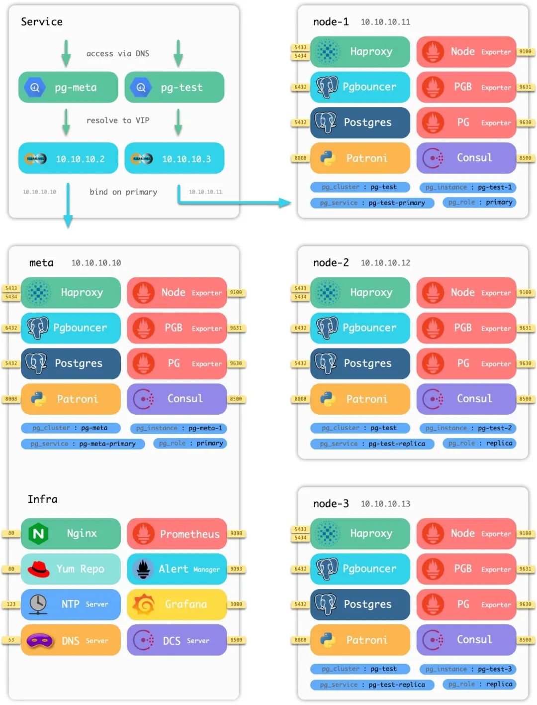 Postgres数据库由高可用组件Patroni管理,Patroni则依赖Consul进行状态同步与领导者选举。所有服务都会注册至Consul中。其中包括各类用于收集监控指标的Exporter。