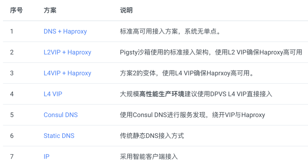 此外,用户也可以选择完全绕开HAProxy,采用传统的静态DNS方式,或Consul动态服务发现,或Consul DNS的方式来连接数据库。只要用户能自行确保连接至正确的数据库实例(读写连主库,只读连从库,在线连连接池,离线直连数据库),那么就没有问题。
