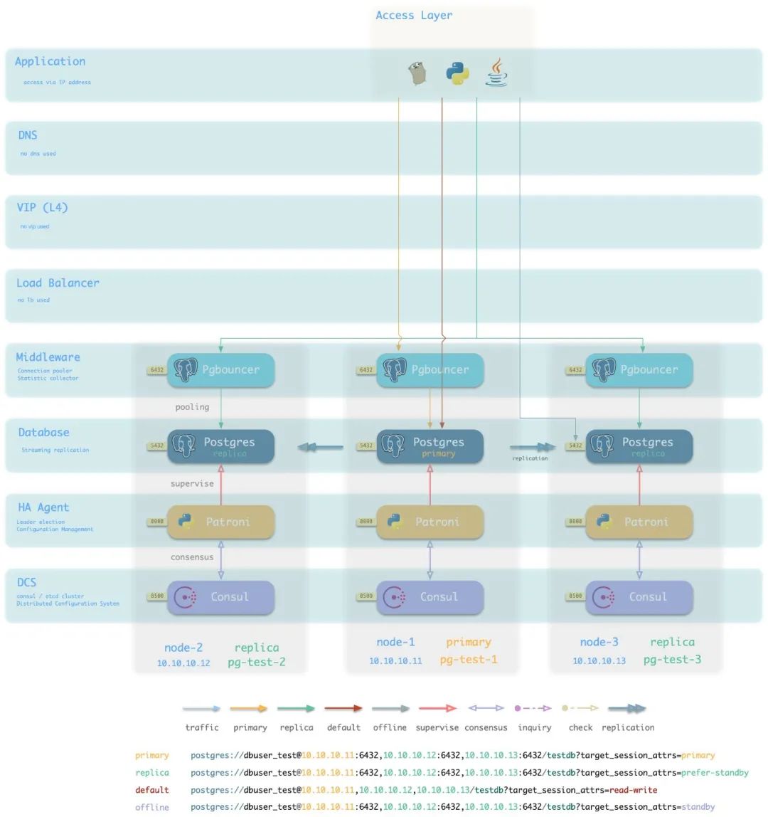 例如,用户可以使用Consul服务发现寻找集群的主库,或者通过连接串中指定多个IP地址与连接属性的方式定位集群主库,或者通过传统静态DNS的方式手工维护主从信息。