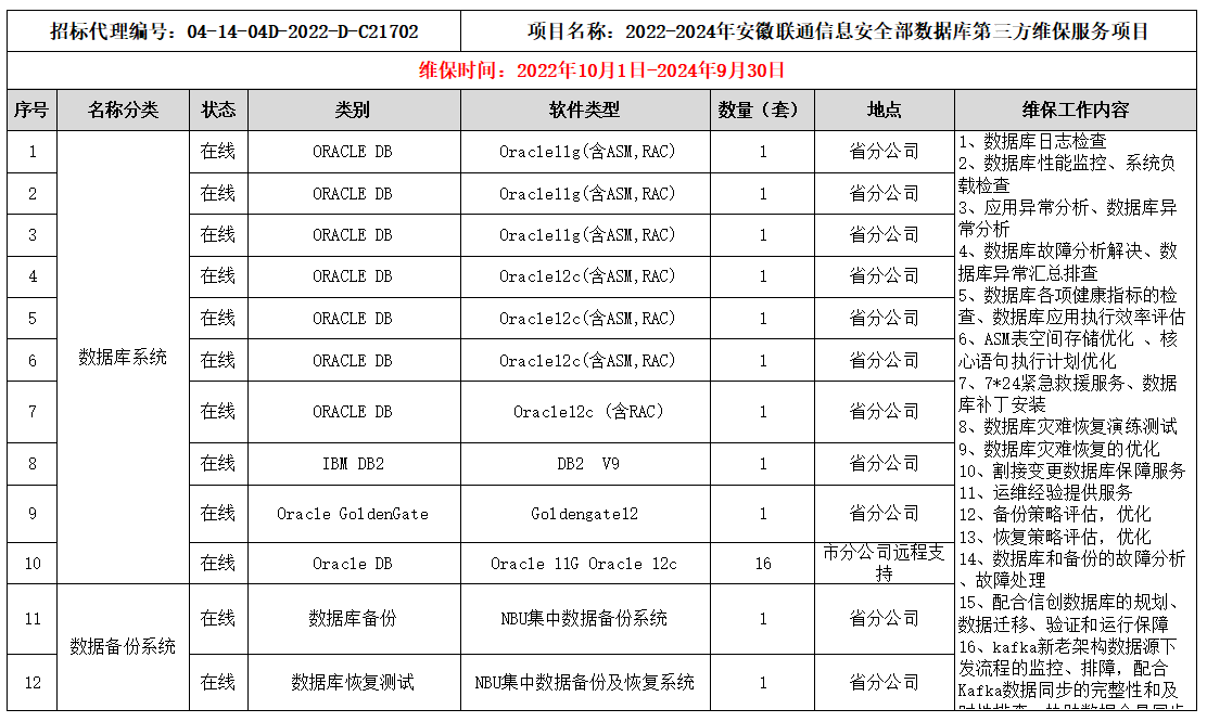 2022-2024年安徽联通信息安全部数据库第三方维保服务项目比选公告
