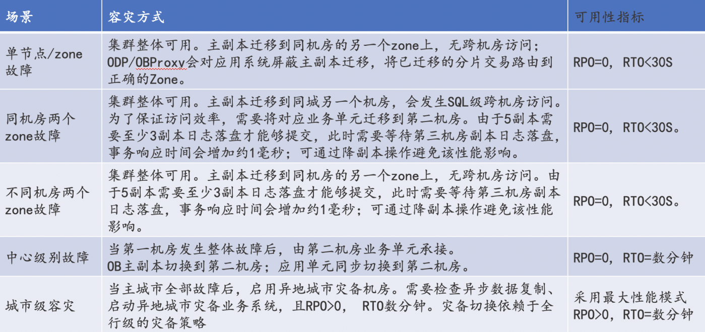 因为客户是第一次在核心系统上使用OceanBase分布式数据库,对稳定性和安全性提出了非常严格的要求,要求我们对全场景进行容灾演练,通过业务容灾演练满足核心A类业务投产要求。为此我们不仅在架构上设计了主城市同城三机房五副本的高可用架构,我们也和应用一起编写了详细的测试案例,来检测我们的高可用方案。通过验证我们在主城市2个副本同时宕机的情况下,完全可以做到RPO=0,RTO<30s,赢得客户信任,提升了客户面对灾难时能切敢切的信心。