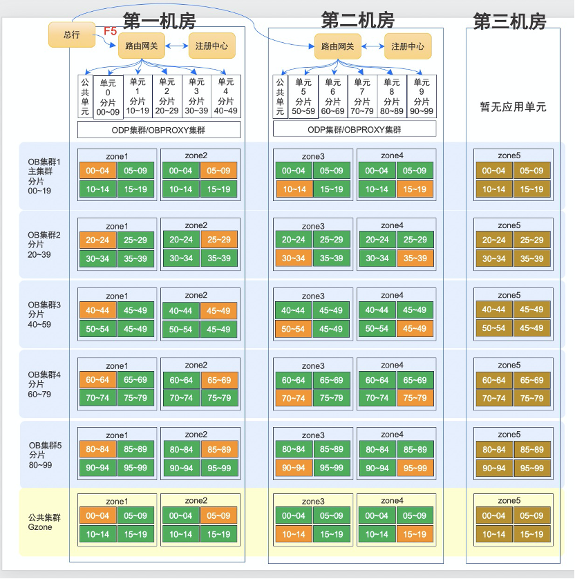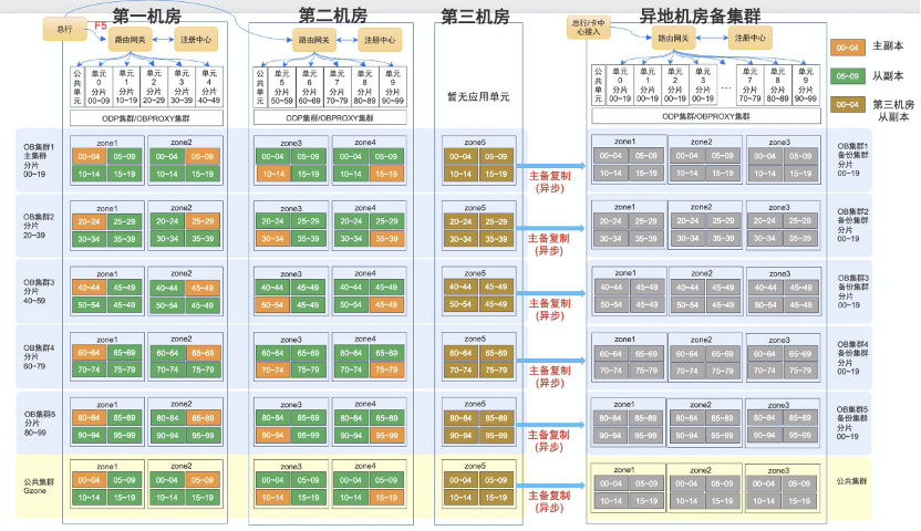 客户核心系统分布式设计,整体部署采用“同城双活+异地灾备”的两地三中心架构,实现同城 RPO=0,RTO 分钟级,异地 RPO 分钟级的容灾目标。其中底层数据库采用 OceanBase 数据库设计的单元化架构,具体如下图: