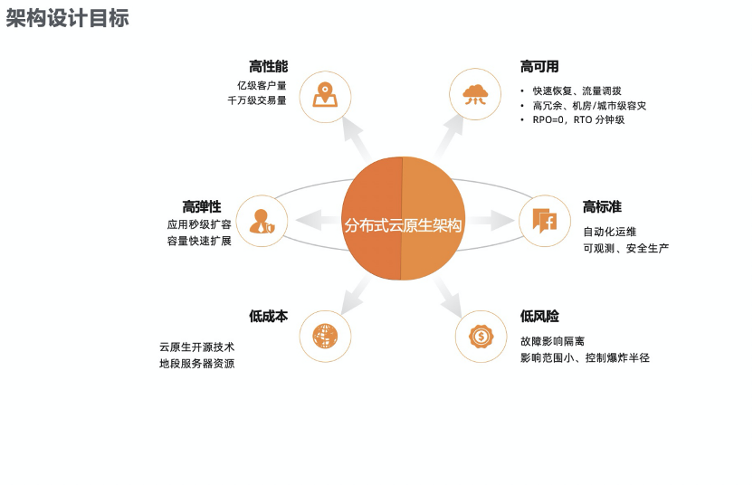 经过和客户对焦,最终明确新一代分布式架构 6 大设计目标,在金融业务场景下满足高可用、高标准、低风险的要求。同时,在互联网场景下需满足高性能、高弹性、低成本的诉求。具体如下图: