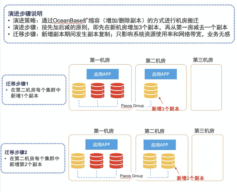 按照整体设计,我们在主城市规划了三个机房,但是每个机房采购及部署到位时间是不一致的。为了不影响应用上线计划,在第一机房主机房机器ready后,我们就开始部署OceanBase集群。首先部署好第一机房单机房三副本集群,提供给客户进行测试验证,同时等待第二和第三机房机器到位,待机器ready后,我们通过OceanBase特有的增减副本以及副本类型在线转换的功能,实现数据的平滑搬迁,最终实现同城单机房三副本到同城三机房五副本的架构转化,整个过程对应用透明,应用无感知,充分体现了OceanBase 强大的弹性伸缩能力。
