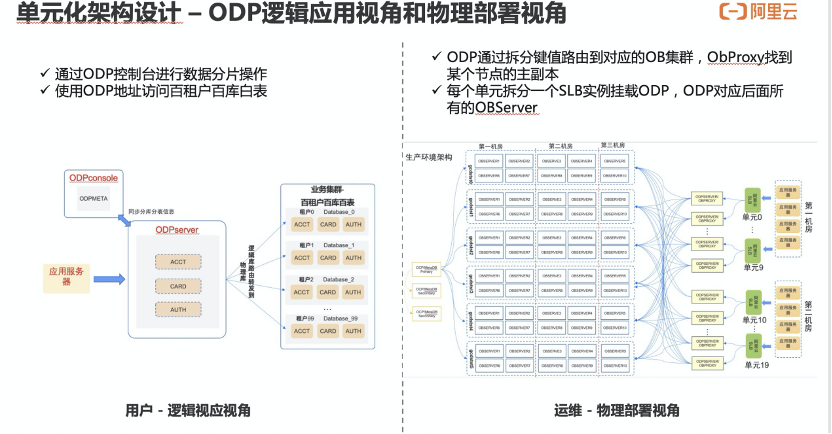 这边重点讲下部署架构,客户核心系统对性能有非常高的要求,在上云过程中经历了几次演进。一次从 ODP 和 OBProxy 分开部署演进到 2 个进程合并一起部署到容器,主要解决网络多一跳耗时和快速弹性扩容问题,并且后续会往 OBSharding 单个C程序演进,解决性能问题。另一次,从一个 SLB 实例挂载后端所有 ODP 实例拆分成每个单元对应一个 ODP SLB ,解决的问题是:1) 在大流量情况下,单个 SLB 流量容易被打满;2)由于应用长连接原因,会导致负载不均,这样对某个 ODP 造成非常大压力,甚至出现 JAVA FullGC;3)某个 ODP SLB出现故障时,不会影响其它单元,符合单元化设计思想。