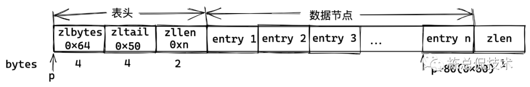 zltail:表示压缩列表中的最后一个元素从压缩列表起始位置的偏移量。图示中,p指向压缩列表起始位置,则p+80(0x50)则指向最后一个元素entry n;
