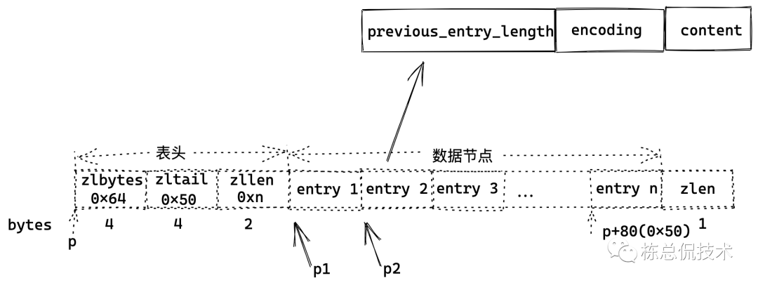 previous_entry_length: 前一个节点的长度,图示中p1(指向entry1的指针)= p2(entry2的指针)- entry2->previous_entry_length。